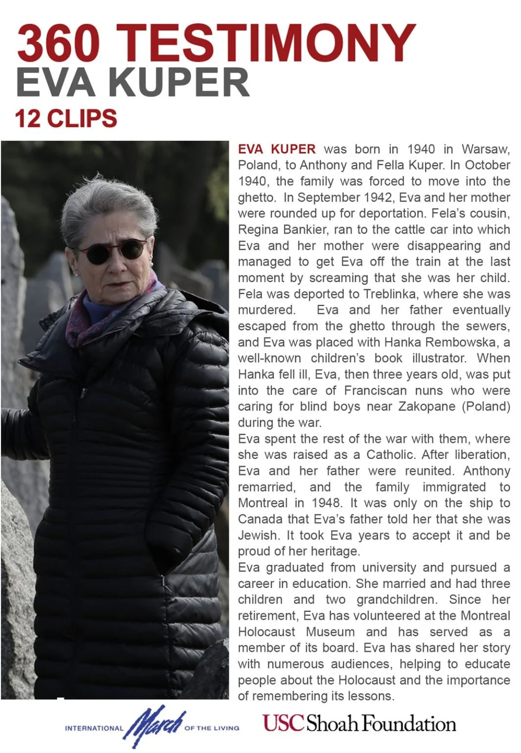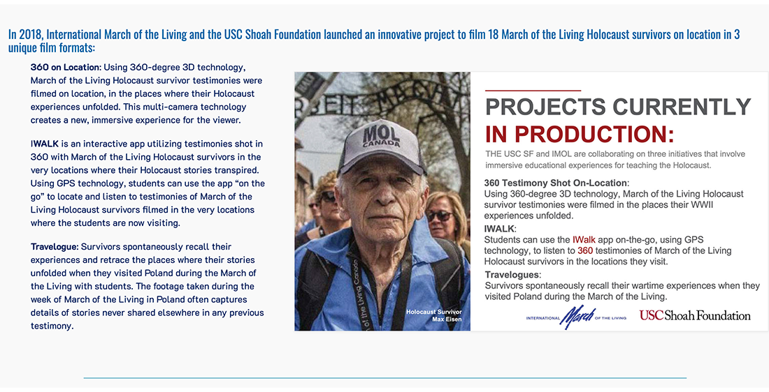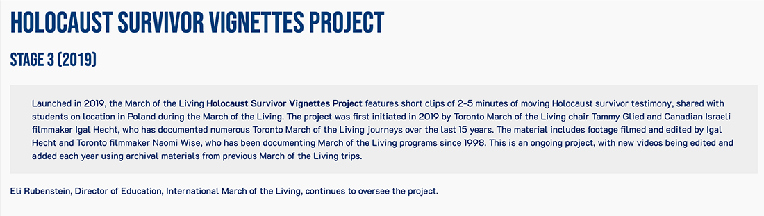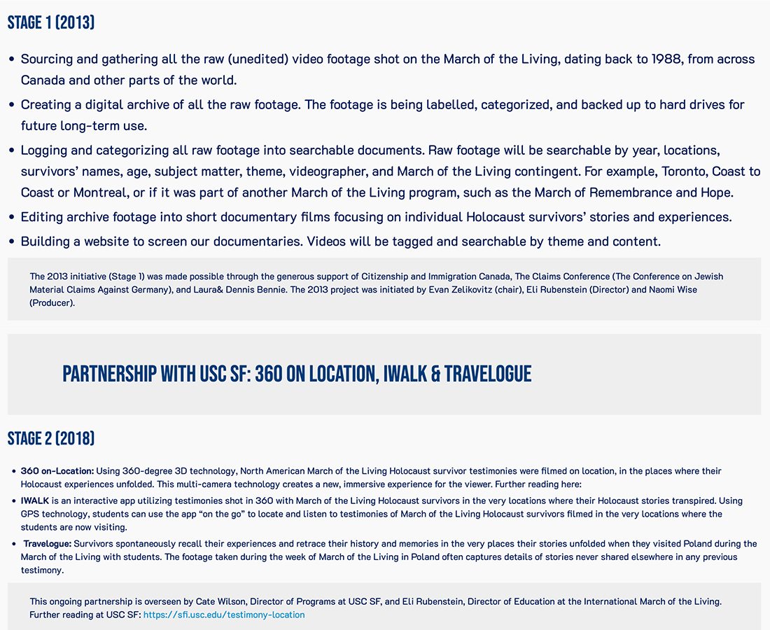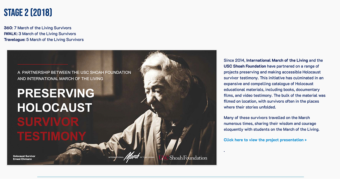 In 2013, the March of the Living Archive Project was established to gather 25 years of precious survivor testimony recorded on video during March of the Living trips. The material has been digitized, logged, archived, and edited into mini documentaries, which will be viewable online, on demand, to the public. This material will prove to be invaluable to students, historians, and anyone interested in Holocaust education. Recently, the project has expanded through various stages below. Visit the site for more information.